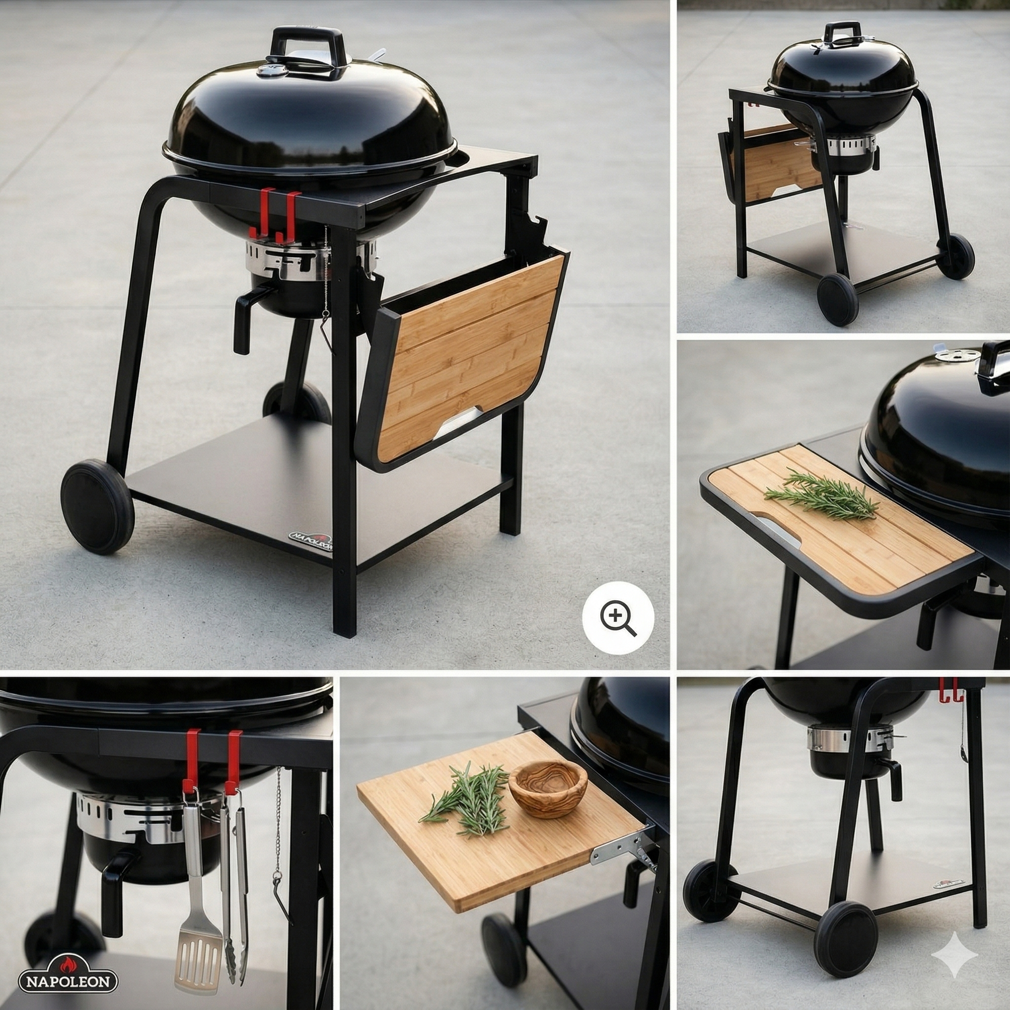 4. Confort de Travail : Profitez de deux tablettes latérales en bois pour garder vos épices et plats à portée de main, optimisant votre organisation.