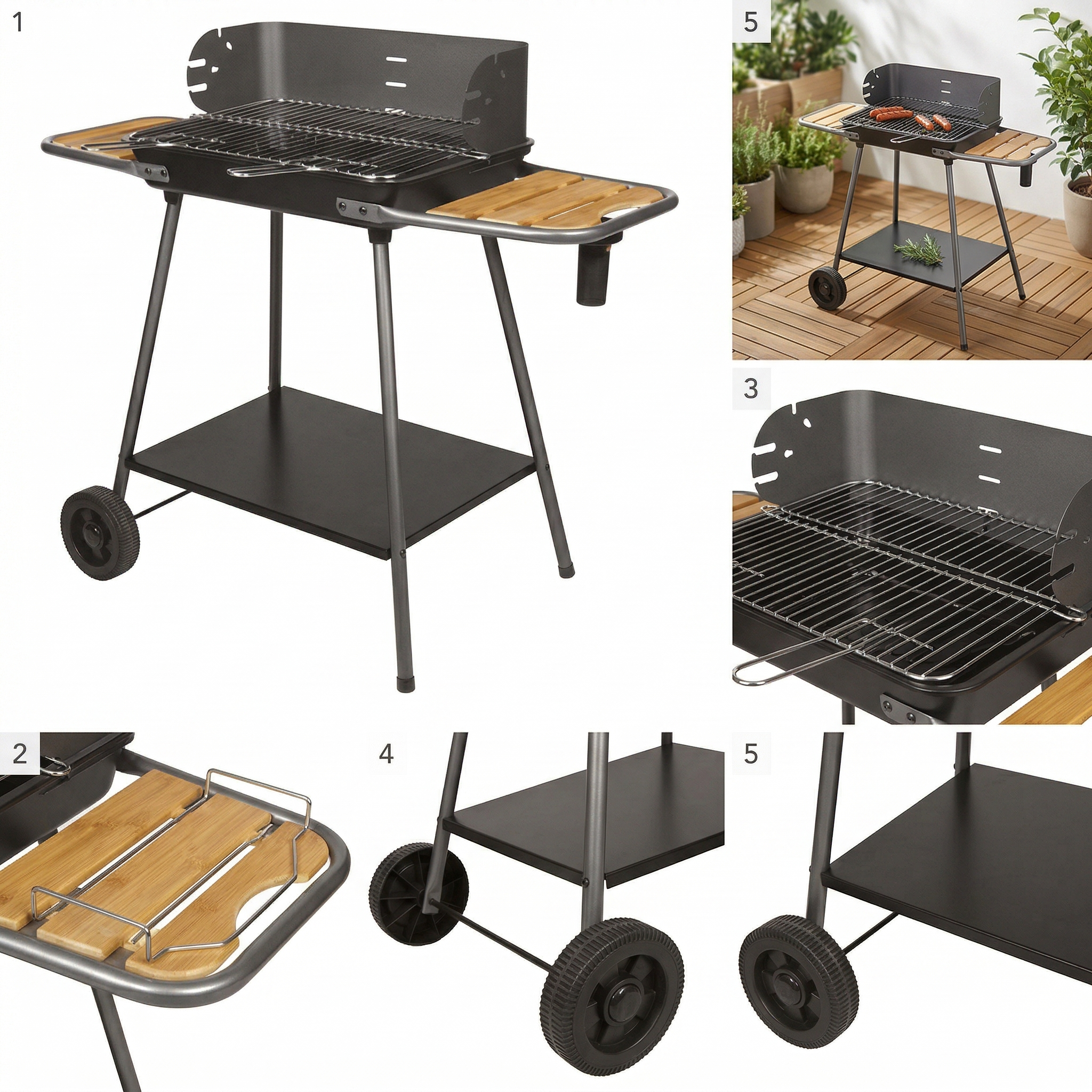 Pensé pour les grandes tablées (jusqu’à 10 convives), ce barbecue n’oublie pas le confort du cuisinier. Monté sur un chariot robuste et stable, il dispose de deux tablettes latérales en bois pour poser vos plats et ustensiles, ainsi que d’une plateforme de rangement inférieure. Son paravent en acier laqué protège vos braises du vent, tandis que la hauteur de grille réglable vous offre une précision de cuisson absolue.