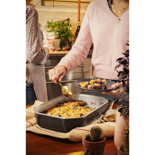 Ce plat rectangulaire réinvente l'art de cuisiner et de recevoir. La finition extérieure colorée innovante transforme un ustensile de cuisson en véritable élément de décoration de table. Cuisinez sainement dans un matériau sûr, puis servez avec style grâce au design soigné et aux coloris tendance.