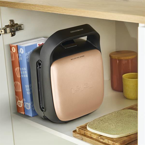 Tefal a pensé aux cuisines où l'espace est compté. L'appareil peut se ranger verticalement pour libérer le plan de travail. Les coffrets de plaques, quant à eux, se rangent comme des livres dans une bibliothèque, offrant un gain de place et une organisation visuelle parfaite. Le coloris inox et noir apporte une touche de modernité qui s'intègre dans tous les intérieurs.